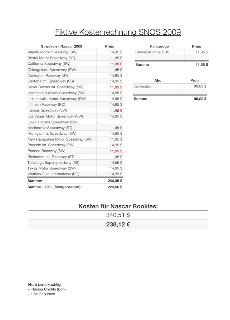 First verlangt für die Nutzung von iRacing einen Mindestbetrag von ca 7,50$ pro Monat. Das sind umgerechnet bei einem Dollarkurs von 1€ = 1,48$ etwa 5€. Auf den ersten Blick nicht viel. Für das Geld bekommt man (nach aktuellem Stand) in der Regel 3 Fahrzeuge und 8 Rennstrecken. Zusatzinhalte müssen jedoch ebenfalls bezahlt werden. Für ein neues Fahrzeug fallen 11,95$ an, für jede Strecken meistens 14,95$. Ähnliches ist durchaus auch bei anderen Spielen zu beobachten: für World of Warcraft müssen neue Gebiete oft per Addon hinzugekauft werden. Trotzdem tritt First hier eine Tür ein, an die sich bisher noch keiner heran hat. Um mal zu verdeutlichen was das ausmacht: um die gleiche Leistung wie eine GNC Nacar Racing Saison in iRacing zu bekommen wären im ersten jahr ca. 340$ zu investieren.